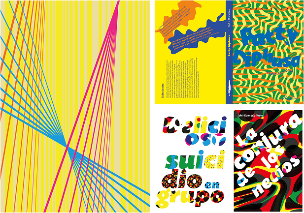 Las pruebas experimentales de semitonos se aplican a las portadas para hacerse una idea se como podría ser. Posteriormente se deforman formas vectoriales y se intercalan e intercalan con el título de la portada.